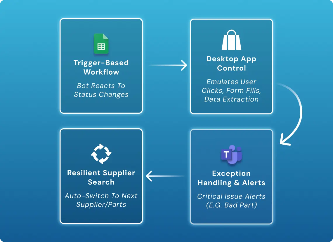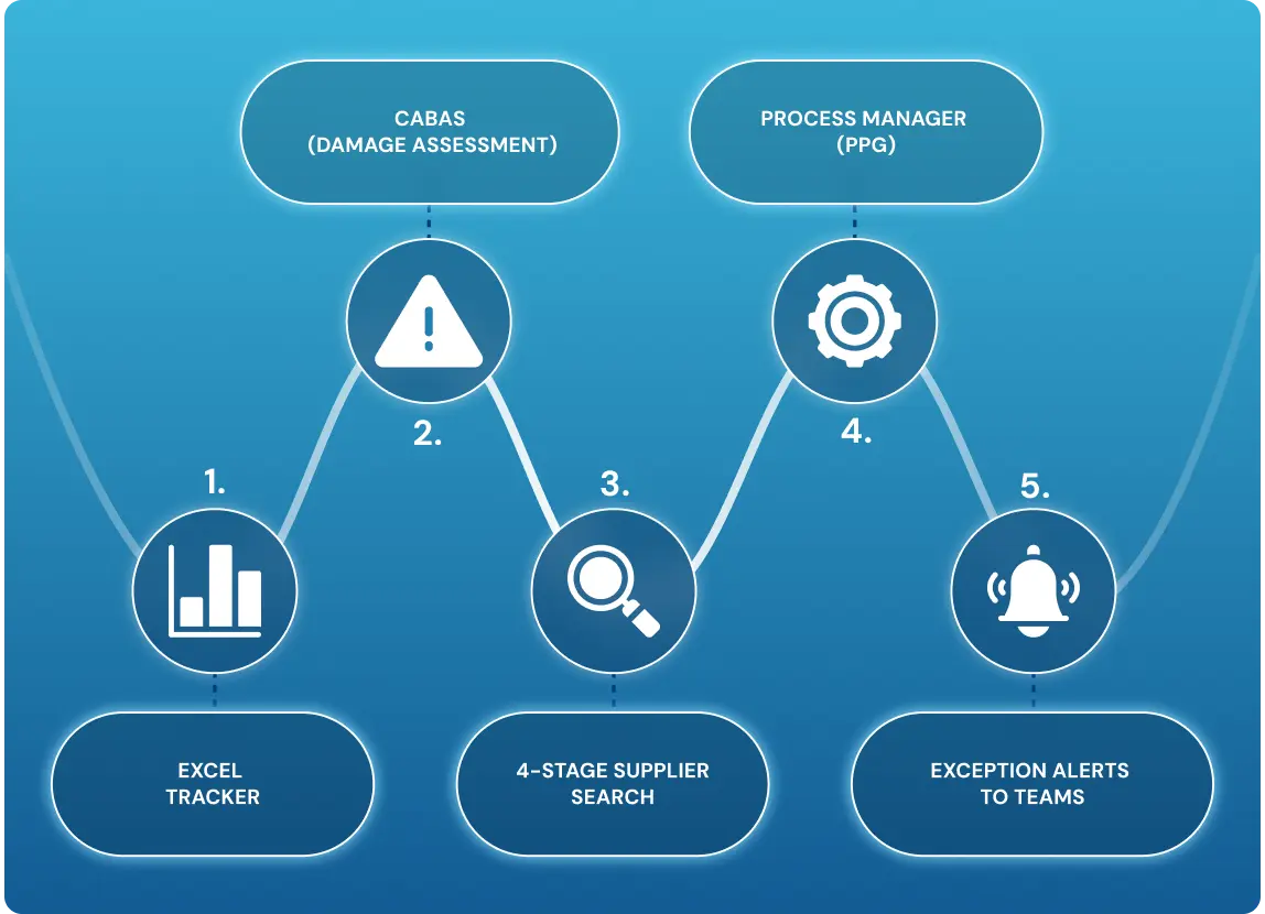 The organization needed to decouple growth from linear increases in headcount. The workflow had to be automated end-to-end, from Excel triggers through the initial claim/part specification system to staged supplier outreach, and finally to parts ordering.